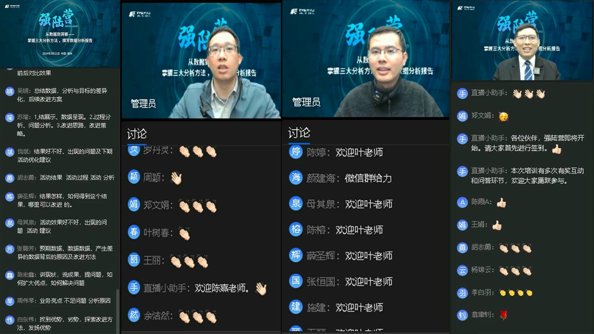 為了提升員工的數(shù)據(jù)分析能力,挖掘數(shù)據(jù)中的潛在價值,更深入地掌握數(shù)據(jù)分析技能,為業(yè)務(wù)決策提供更加精準的支持,實現(xiàn)數(shù)據(jù)驅(qū)動業(yè)務(wù)的目標。3月21日,集團人力資源部特別邀請新大陸大學(xué)堂內(nèi)部講師葉欣杰、陳熹,通過線上直播學(xué)習(xí)和交流互動的形式,旨在通過實戰(zhàn)教學(xué),讓學(xué)員們快速掌握三種數(shù)據(jù)統(tǒng)計分析工具,并學(xué)會撰寫高質(zhì)量的數(shù)據(jù)分析報告。此次培訓(xùn)吸引了集團總部及各經(jīng)營單位的研發(fā)與產(chǎn)品人員共計344人參與報名。培訓(xùn)當(dāng)天,互動熱烈。