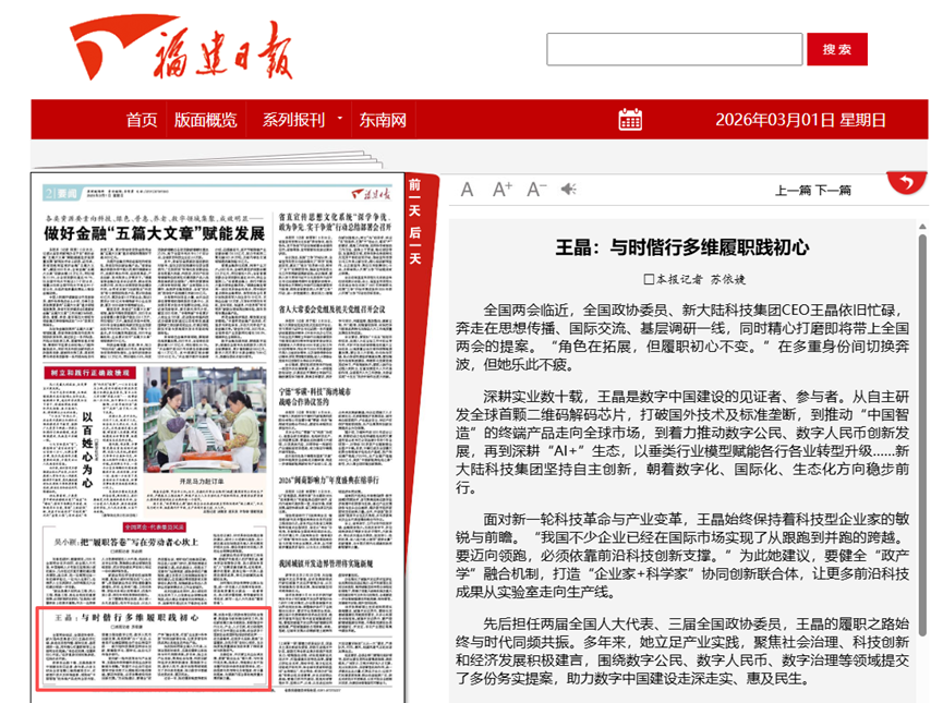 《福建日報》以《王晶:與時偕行多維履職踐初心》為題,深入報道王晶“奔走在思想傳播、國際交流、基層調(diào)研一線,同時精心打磨即將帶上全國兩會的提案”。