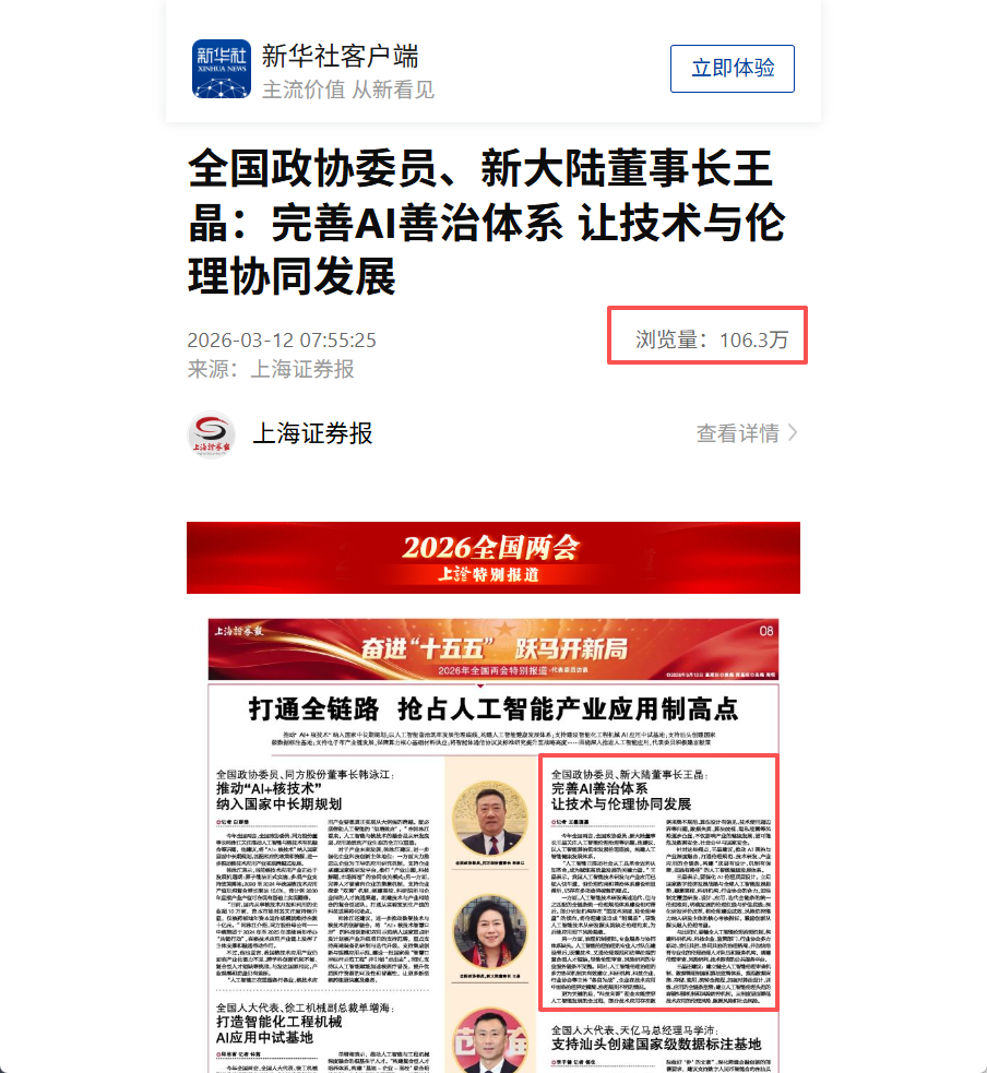 新華社刊發(fā)上海證券報《全國政協(xié)委員王晶:完善AI善治體系 讓技術(shù)與倫理協(xié)同發(fā)展》,單篇閱讀量已突破百萬。