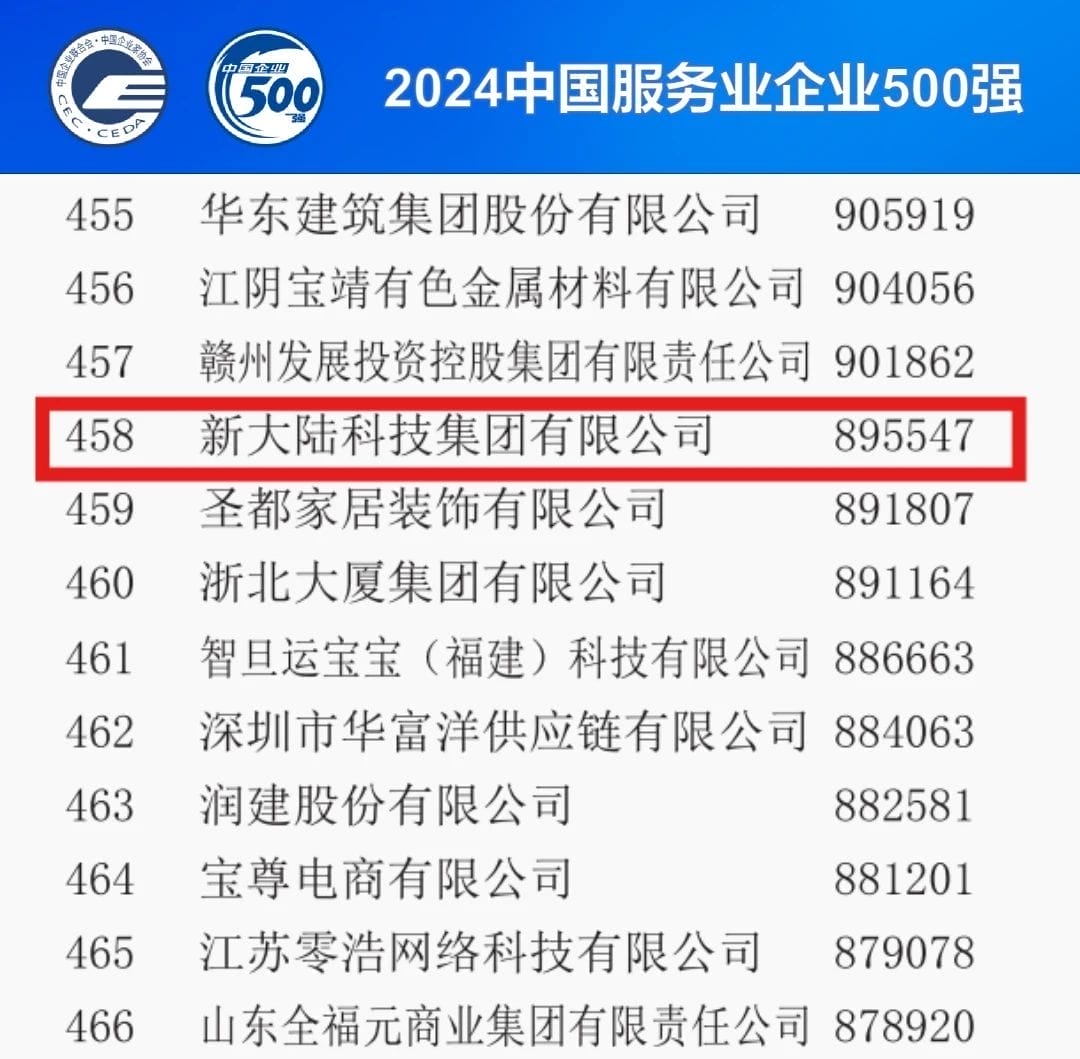 9月11日,以“向‘新’而行 打造更多世界一流企業(yè)”為主題的“2024中國500強企業(yè)高峰論壇”在天津市舉行。會上,中國企業(yè)聯(lián)合會、中國企業(yè)家協(xié)會發(fā)布了2024中國服務業(yè)企業(yè)500強相關(guān)榜單及其分析報告。新大陸連續(xù)五年躋身500強行列。入選企業(yè)還有國家電網(wǎng)、中國工商銀行、中國建設銀行等。